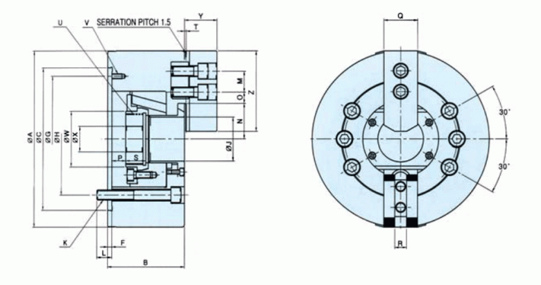 特征:夹紧不规则工件 : 此卡盘在不规则工件夹紧时,显示出其优越性,尤其活用于方杆加工和使用棒料输送机对不规则工件进行夹紧 。• 性能好、精度高 : 此卡盘与CGH型卡盘结构相同,因此确保其优越的性能和质量,且附件和连接部件具有兼容性。• 直接安?型 : 可直接安装在符合国际标准A型主轴的短锥安装面上。