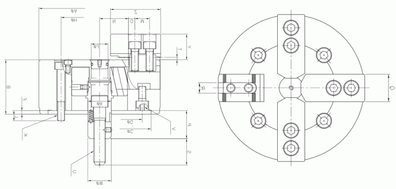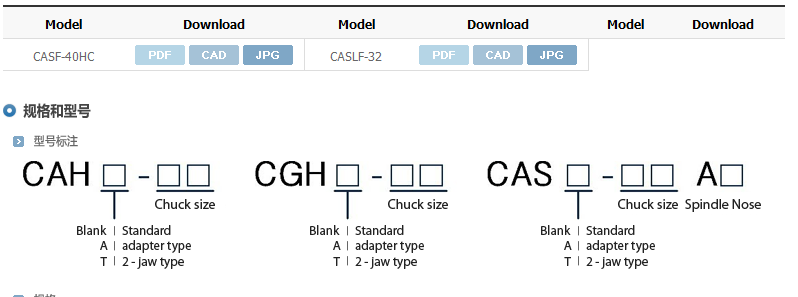 特征:• 性能好、精度高 : 此卡盘与CAS型卡盘结构相同,因此确保其优越的性能和质量,且附件和连接部件具有兼容性。 • 直接安装型 : 可直接安装在符合国际标准A型主轴的短锥安装面上。