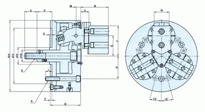 特征:• 加紧力强 : 此卡盘的卡当能拉住加工工件,将其?在至卡盘基准面,牢固卡紧。• 加紧锥形件 : 此卡盘能牢固卡紧锥度在20度以内表面凸凹不平的铸件和锻件的锥面,还可加紧工件的内外径。• 摆动型卡爪 : 当卡爪处于平衡状态下,在加工工件的表面直线摆动5度以内,加紧最牢固。• 防尘性能好 : 为了防止外界物质和碎屑进入卡盘,我们在锁柄上罩上防尘罩。
