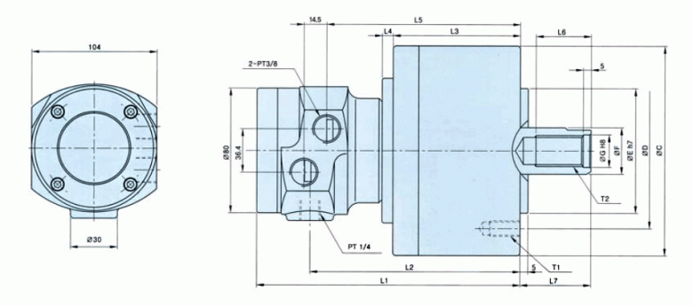 特征• 经济型 : 此产品是一种最经济型的回转油缸,在工件不穿过主轴箱的情况下使用。• 水平与垂直安装均可 : 此型号的回转油缸既可水平安装也可垂直安装,因此,可安装在立式车床上。• 体积小、重量轻 : 此型号的回转油缸采用铝合金铸模的方式生产,因此具有结构简单、体积小、重量轻的特点。• 高速旋转 : 经过动平衡处理的回转油缸在高速旋转的情况下也能确保其安全性。