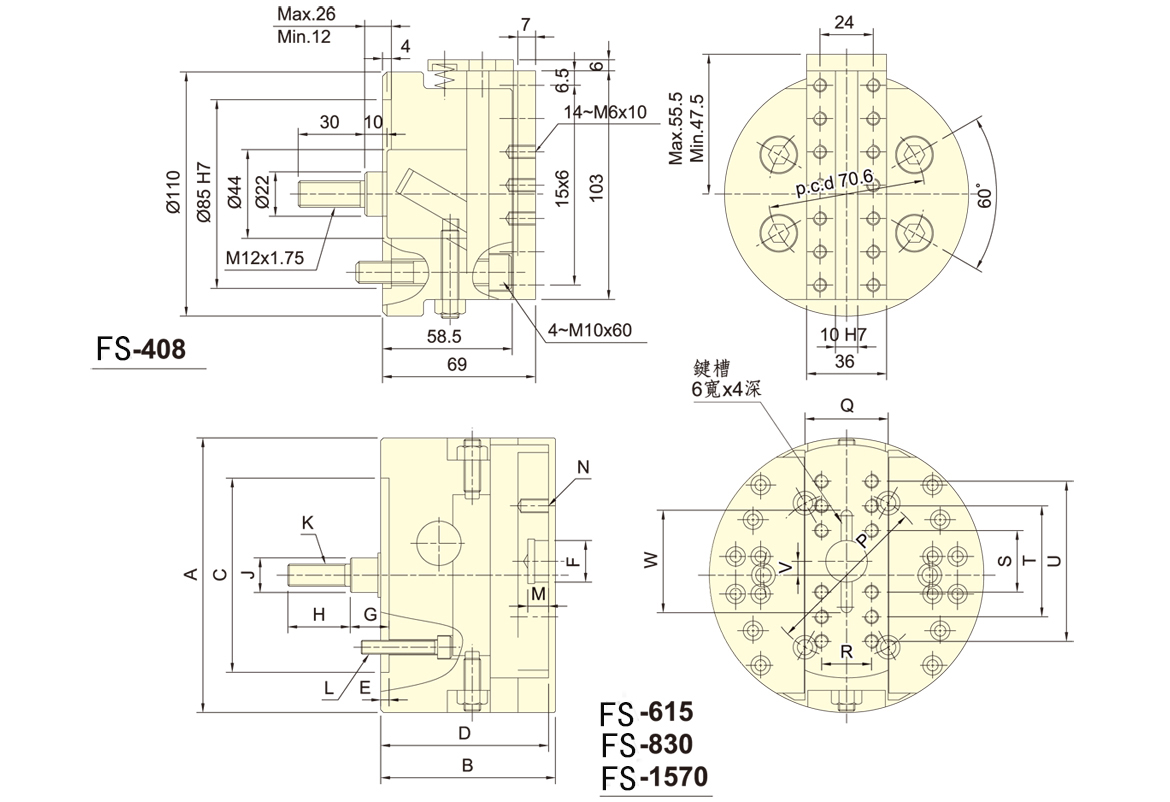 FS-840 | 6~M12x85 | 238 | 90 | 60 | 42 | 12 | 45 | M10x15 | 12 | 45 | 10 | 6 |